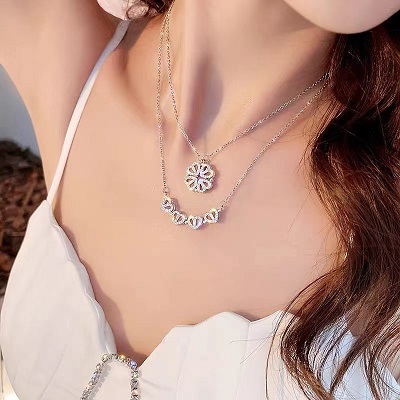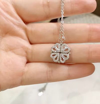 This versatile necklace can be worn in 2 ways, as a four leaf clover or a romantic four hearts. The pendant magnetically transforms hearts into clover shapes.