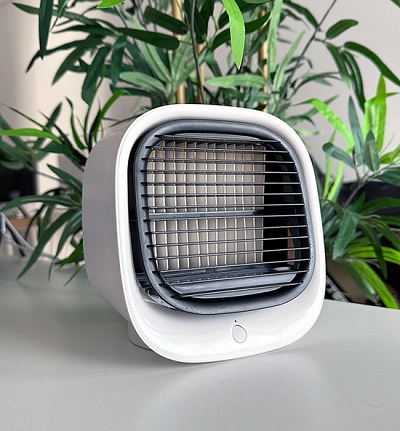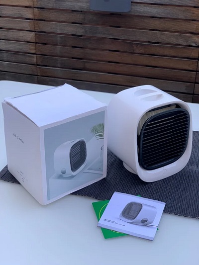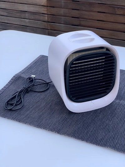 The portable battery-powered air cooler has a 2000mAh battery and a built-in USB charging port, so you can power it up with a power bank or socket anywhere you go.