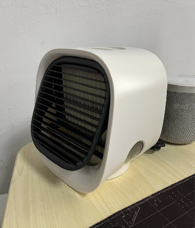 The portable battery-powered air cooler has a 2000mAh battery and a built-in USB charging port, so you can power it up with a power bank or socket anywhere you go.