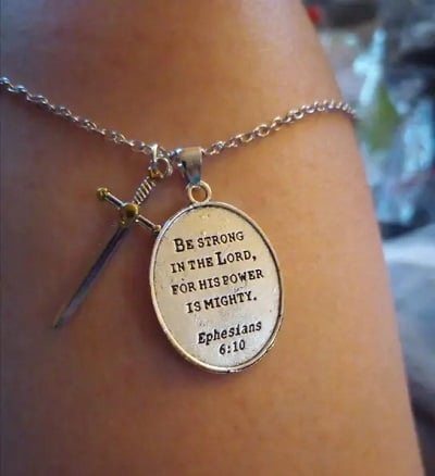 This is a good quality and attractive necklace. The pendant and sword are well detailed. The engraved prayer on the back also looks good.