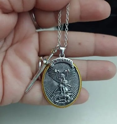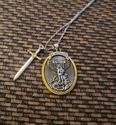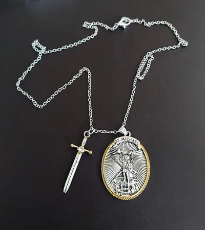Great necklace that features a St Michael pendant and his sword that he is famous for. The sword is like a charm that is made quite solid. My son is getting confirmed in the Catholic religion soon and thought this would be a great gift. Not to mention his middle name is Michael. Great value!